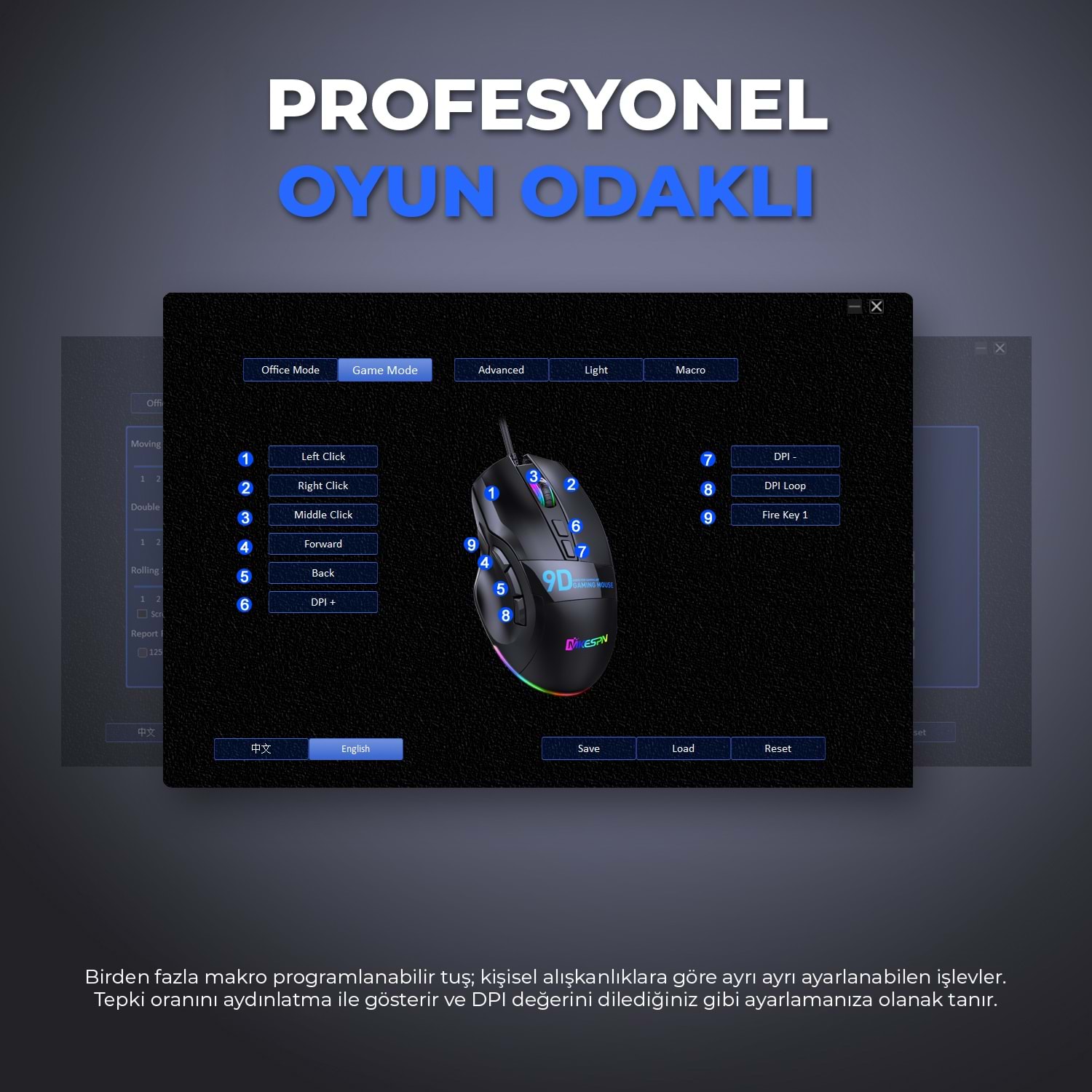 12800 DPI • 1000Hz • 9 Programlanabilir Tuş Makro • RGB Aydınlatmalı • Ergonomik Tasarım